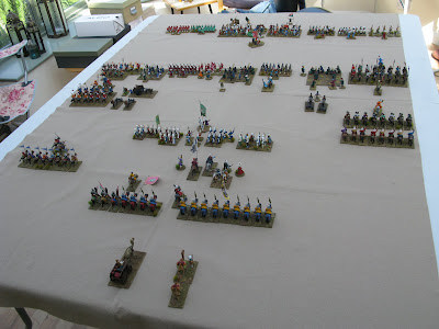I could spend some more time in painting and basing figures but first I decided to have a look at the collection. A couple of years have passed since I had all my figures on a table; here is the smaller half of them. These are the European forces, their opponents are a force of the Ottoman Empire. When I opened the boxes I found a couple of casualties; a grenadier's drum and a dragoon's pistol arm had fallen off. That arm is proving very difficult to reattach, so there is an empty saddle whilst I sort this.
